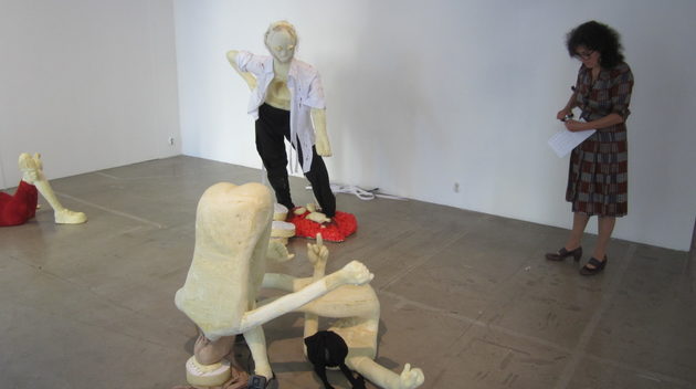 Liknande idéer och material förekom för några år sedan i en utställning på Galleri Sculptor. Då var det mera frågan om kuber och tärningar i polyuretanskum som samlat på sig avfall. Med fanns också en installation skildrande våld och mobbning. Hon har nu gått vidare på tematiken och karvat fram två sköra, trasiga kroppar i detta skummaterial. Både den misshandlade och provokatören tycks falla i bitar.