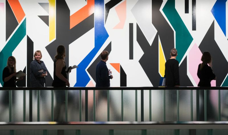 Traditionellt har abstraktionen i konsten uppfattats som en rörelse bort från den figurativa efterbildningen i riktning mot den rena bilden. Mether-Borgström ville uttryckligen att man skulle uppleva hans verk, inte tolka dem. Sarah Morris betonar däremot hur vi ser på rummet och hur vi kodar den konstruerade världen omkring oss. Hon inleder sin utställning med en 30 meter lång färgstark väggmålning. Det tog cirka tre veckor för Morris’ assistenter att förverkliga de släta färgytorna som hon skissat fram på dator. Morris, är känd för sin särpräglade användning av färger och har starkt tagit fasta på Aarno Ruusuvuoris arkitektur, samt de omgivande tallarna. Lätt kunde man tro att verket är planerat för denna byggnad på sextiotalet. Men Morris är mera mångfasetterad än så. Sedan 1990-talet har Morris gjort platsbundna målningar och filmer, i arkitekturlandskap från storstäder som New York, Los Angeles och Chicago.