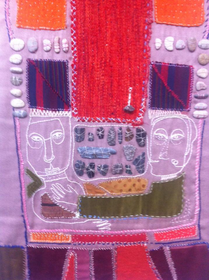 Målningarna och applikationerna sträcker sig från golv till tak i en så kallad gammaldags salongshängning. I den stora salen hänger Karin Hellmans stora collage och applikationer på tyg. Politik, miljöfrågor och pacifism hittas i hennes verk bland lekfulla modernistiska former, i experimentella material såsom yllebitar, järnskrot, stenar, lerbitar, papper, text och fotografier. Karin Hellman gjorde sin allra första applikation, Flickan och tuppen, av familjens utslitna kläder så tidigt som 1955. Den experimentella tekniken är banbrytande med tanke på hur konservativ den finska konstscenen var under denna tid. Karin Hellman såg möjligheter i textil, något som kvinnor sysslat med i århundraden och hon valde att göra något helt annat av handarbetet: i detta finns en slags revolutionär anda, som då hon abstraherar en stridsvagn i svartvitt. Feministisk konst