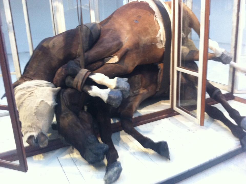 Utställningen inleds med en stor och introvert skulptur av hästskinn iscensatt i en gammal, halvöppen fönstervitrin. No Life Lost II är gjord för två år sedan och vad som först ser ut som två på varandra liggande hästkroppar visar sig egentligen vara tre. De Bruyckere är bosatt i Gent i Flandern där hon också är född och uppvuxen. Det var i denna stad som en av första världskrigets råaste strider ägde rum. Flanders Fields Museum beställde ett verk av henne för 18 år sedan och det var då hon tog fram hästskulpturer som en metafor för krigets oskyldiga offer, och som hon sedan dess har uttryckt i många olika skepnader. De döda hästarna erhåller hon från universitetet i Gents veterinärlinje. Hästinstallationen väcker frågor om vad vi människor egentligen är i en flock av andra djur. Och för mig närmare den hisnande tanken om hur allt som skedde under första världskriget lätt kunde ske igen.