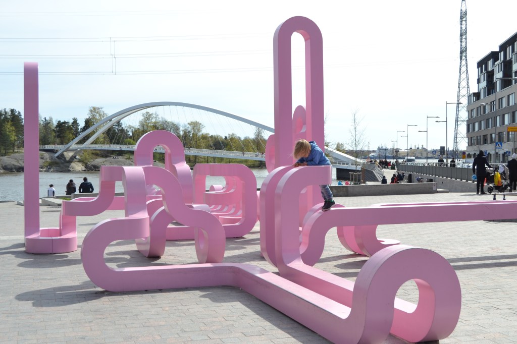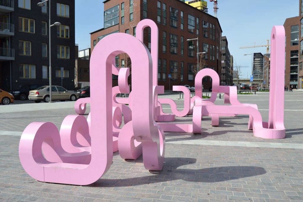 Jacob Dahlgrens knallrosa slingrande stålskulptur i Fiskehamnen är ett exempel på offentlig konst som också fungerar som lekplats. Verket bidrar till att ge det nybyggda området en identitet.