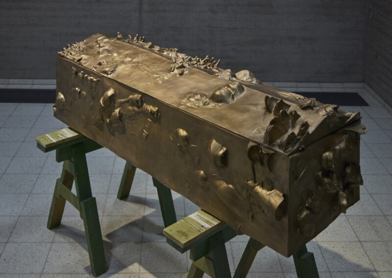 Detsamma gäller guldsarkofagens fötter och fingrar som spretar i dödsångest eller gipsfiguren, formad efter av Pitts kropp, som sätter sitt huvud i ett skruvställ. Alla känner till hans mörka livssituation och Pitts verk är gjorda i terapisyfte, men det blir för tydligt. Bäst är att se honom som en del av Houseagos berättelse. Jag undrar om utställningens storskaliga, terapeutiska skulle fått samma effekt om de tre varit okända personer?