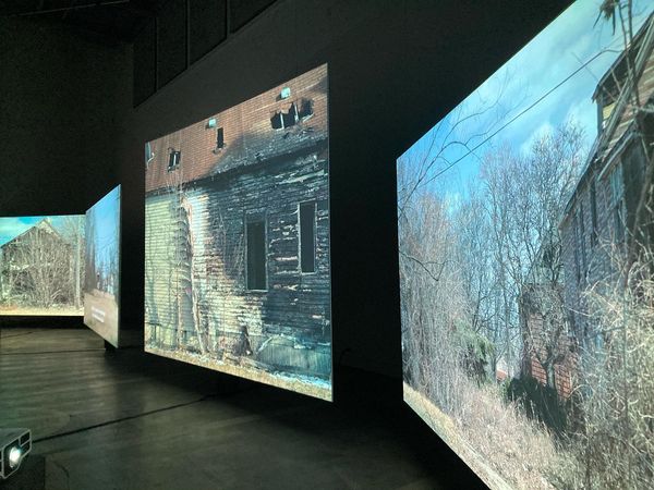 Hängningen i konsthallen är luftig och växlar mellan film och fotografi. Man kan tillbringa en hel eftermiddag i utställningens säckstolar, filmerna som projieras är allt från 15–55 minuter långa, men man behöver inte följa dem från början till slut. Även om man lätt slukas med, konstnären är en stark berättare. Det första rummet upptas av en alldeles ny fiminstallation Scenic View (2023) som visas på fyra skärmar som är placerade i en dynamisk visuell helhet där bilderna växlar rytmiskt. Blåfield tar sats från det traditionella sättet att skildra skogslandskap, framförallt inom måleritraditionen, och visar att skogens ekosystem är helt annorlunda, likaså blottar Blåfield dokumentärfilmandet i sig: vad är verkligt och vad är overkligt, var går gränsen? Blåfield agerar lugn och saklig sagoberätterska. Plötsligt avbyts idyllen och hon avslöjar hur allt egentligen ligger till och börjar om från början. Björnen äter inte blåbär, utan hon har lockat honom till platsen med annan mat. Själv sitter hon gömd och instängd i en kamouflerad koja och filmar. Att det hela utspelar sig 900 m från ryska gränsen bryter också markant från den inledande måleriska landskapsidyllen. Från den gröna filmkojans fönster zoomas plötsligt vyer från Detroits förorter: en helt annan typ av skog med enorma lönnträd, vildvuxna forna trädgårdar, ett stört ekosystem där naturen bryter ned bebyggelse. Från detta leder hon oss till finländsk planterad skog. Blåfield visar att allt har två sidor. Till slut slår allt över till en okontrollerad fantasibild, mossa som bubblar upp, rötter som rör på sig, mystiskt slem som rinner över.